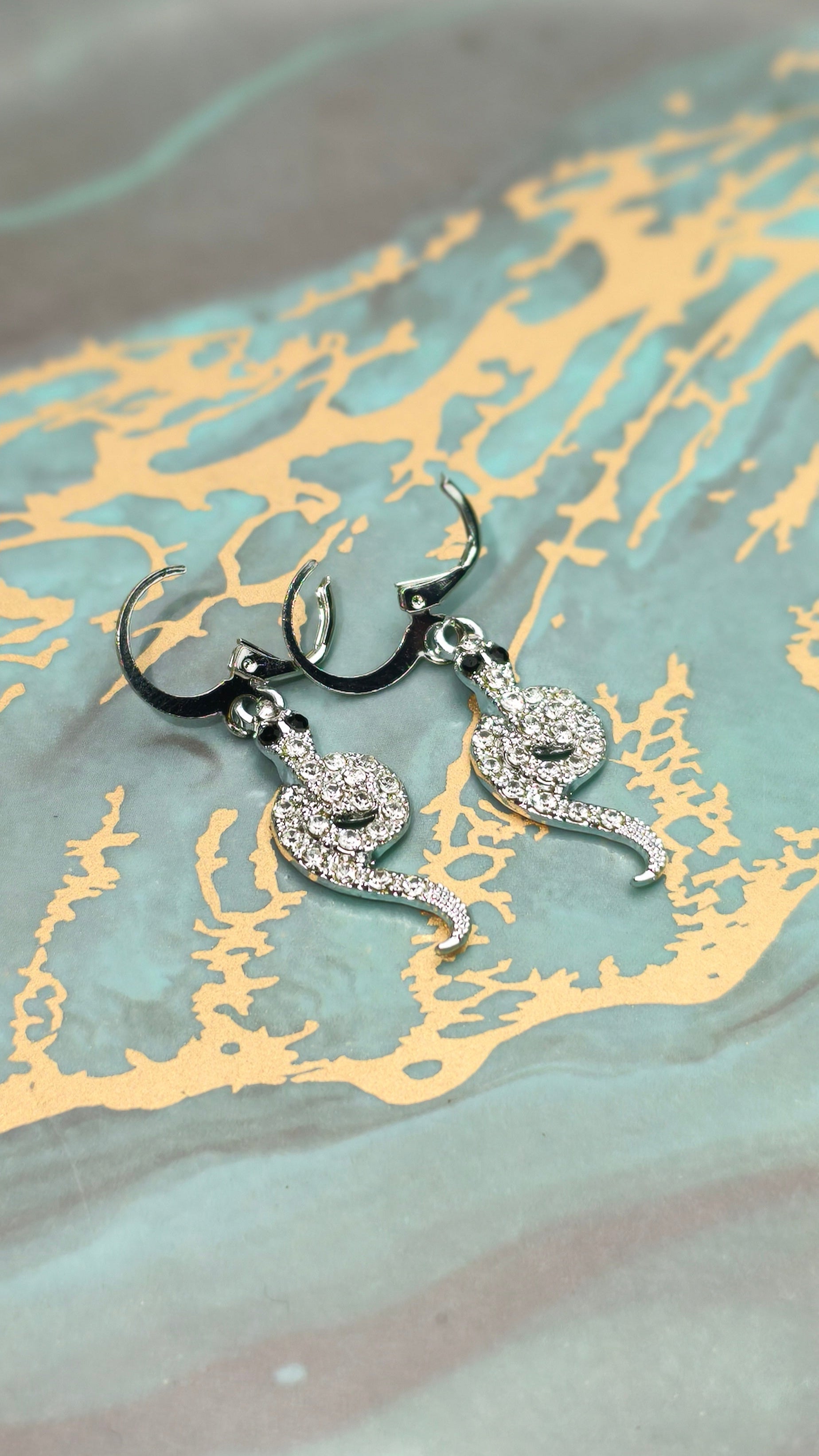 Turn heads with these exquisitely crafted snake-shaped hoop earrings, designed to embody bold elegance and timeless charm. Each piece is encrusted with high-quality, precision-cut rhinestones that shimmer with every movement, offering a luxurious sparkle that rivals fine jewelry.